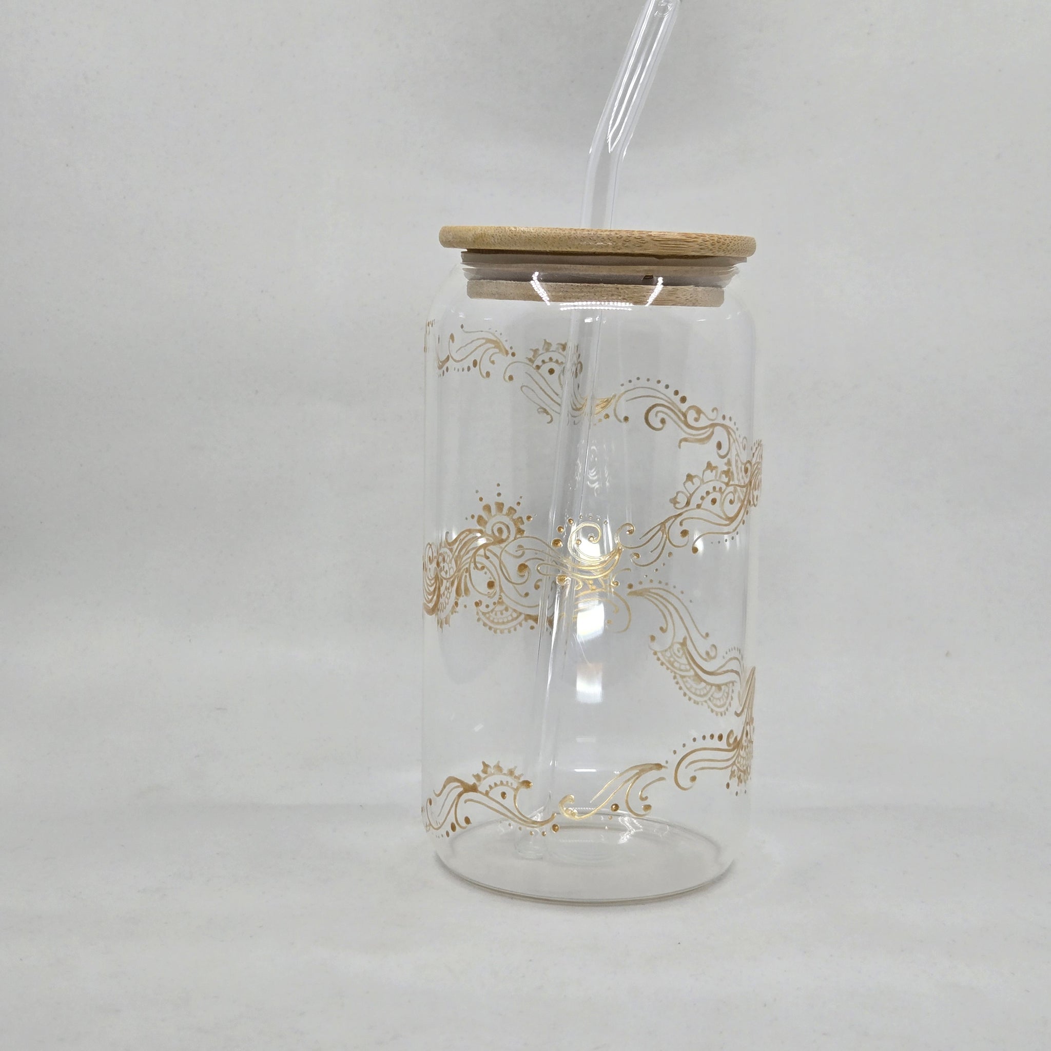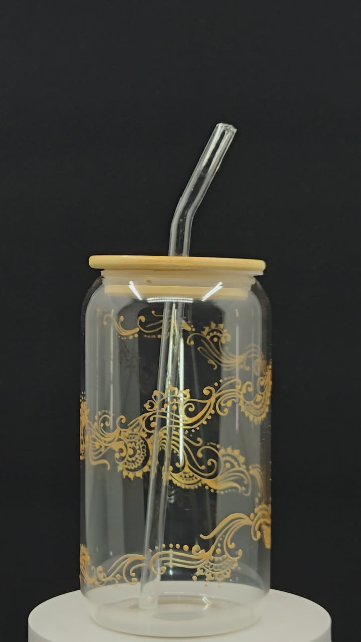 One beautiful hand painted tumbler with a bamboo lid and glass straw. Made of borosilicate glass (lead and BPA-free) it is crystal clear, sturdy and durable. The thick clear glass can be used for hot or cold drinks and is easy to take on the go with the bamboo lid that fits on snugly. Or you can use it at home as a regular glass- using the lid is optional. They are definitely conversation pieces and make excellent gifts! Check out the video to get a full view.