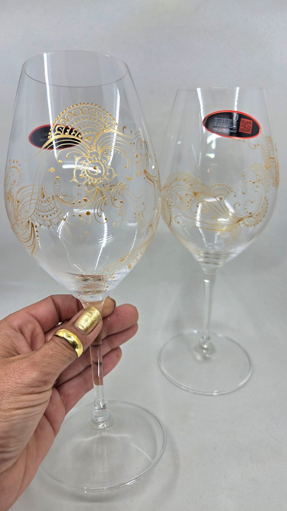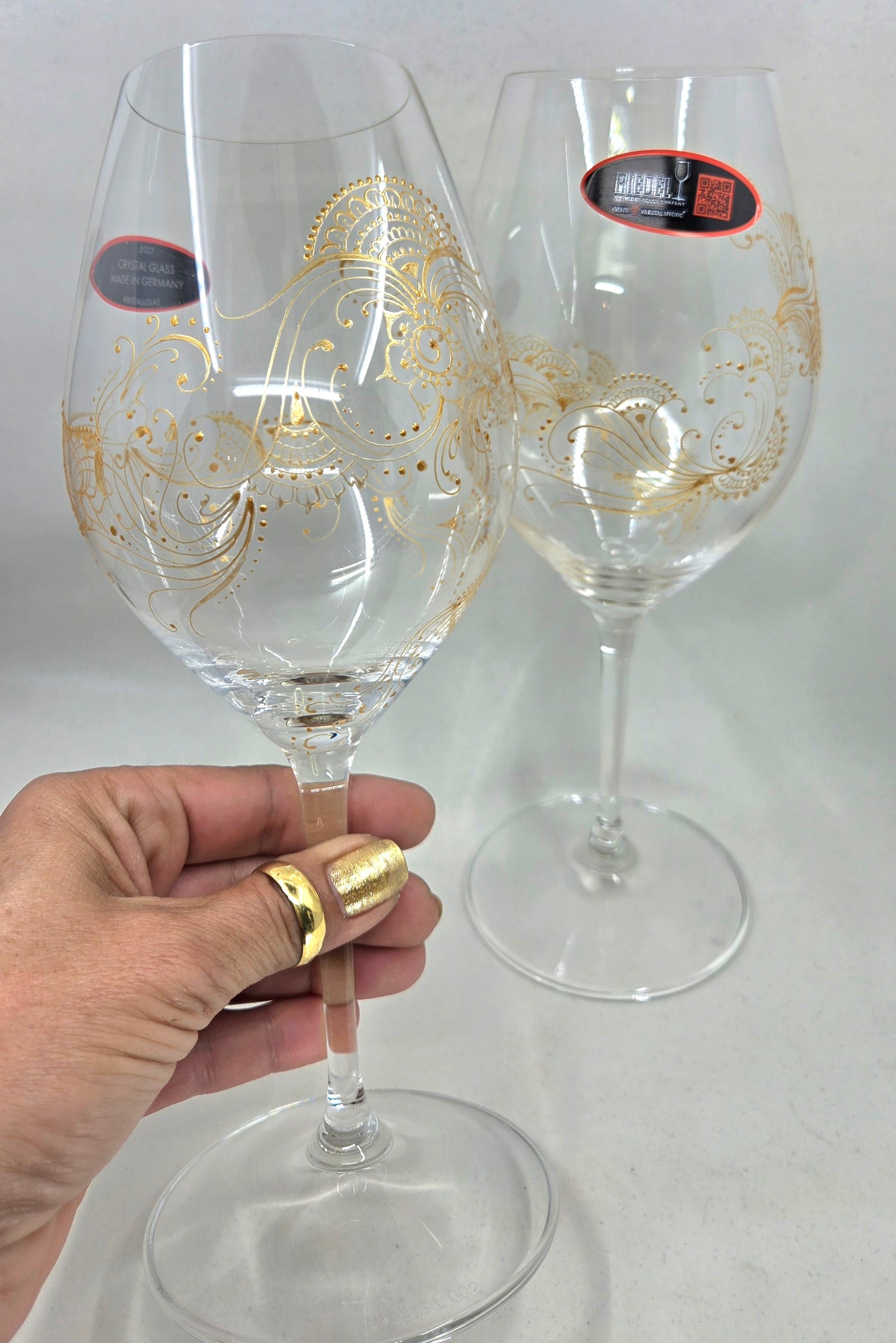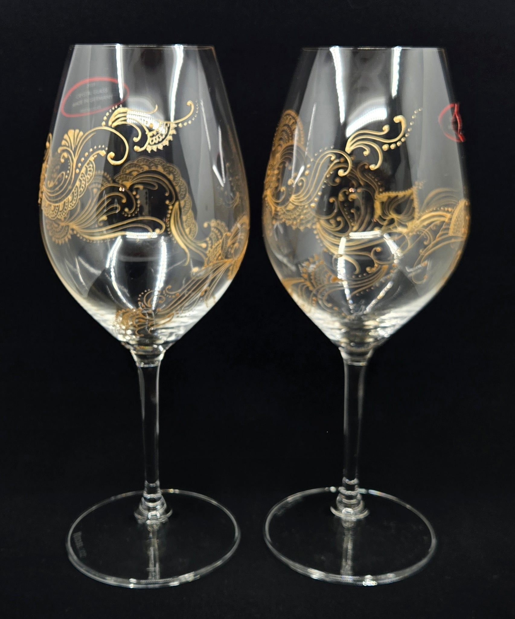 A set of 2 handpainted red wine glasses on Riedel crystal. Riedel glassware is widely considered to be of very good to excellent quality, highly regarded for the clarity and brilliance of the crystal and the ability to enhance the wine-tasting experience through its design. Intricate artwork winds all around the glass. So satisfying to twirl in your hands and marvel at the detail while you are enjoying a glass of wine. These wine glasses are rather unique and definitely conversation pieces. They make excellent gifts! Check out the video to get a full view.