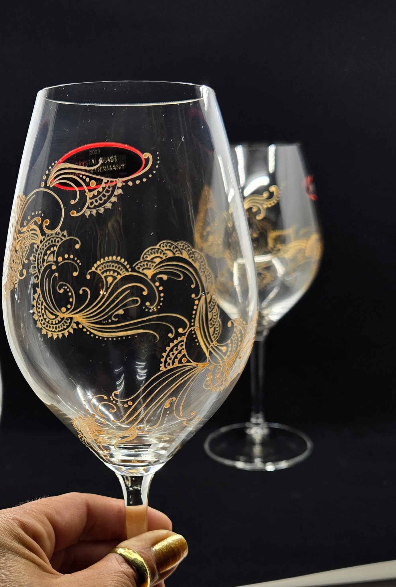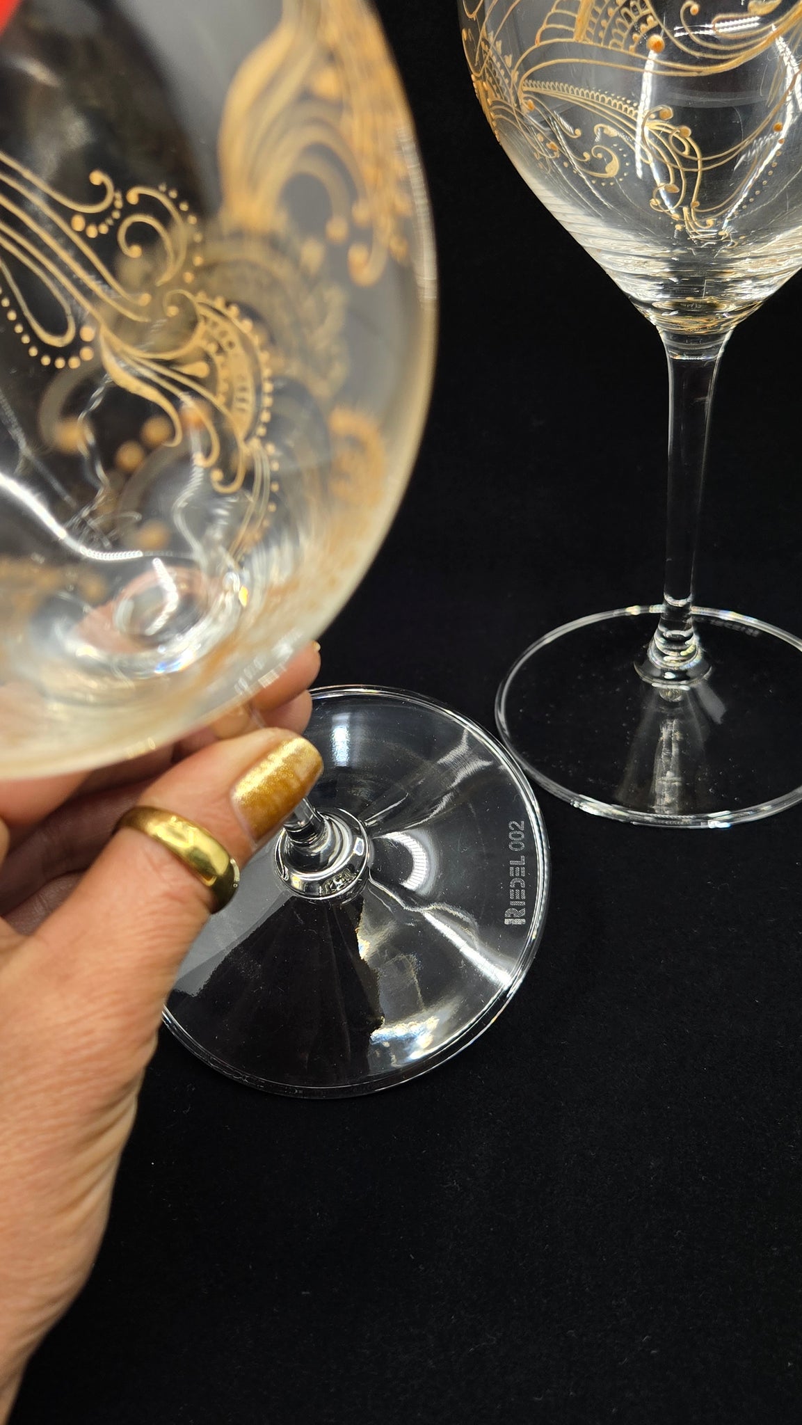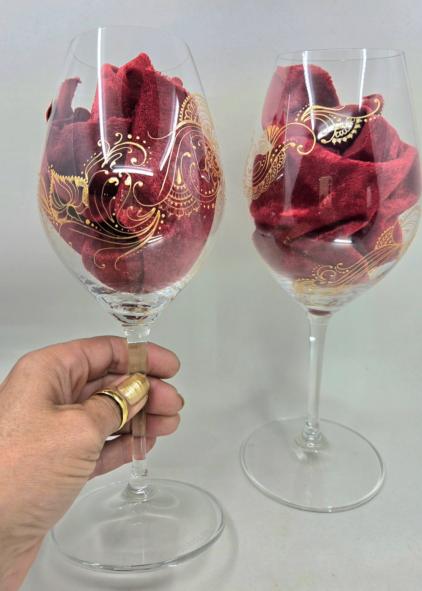 I have inserted red velvet inside the glass for some of the photos to illustrate what the glass will look like with wine in it and also to have more contrast for you to see the intricate designs.