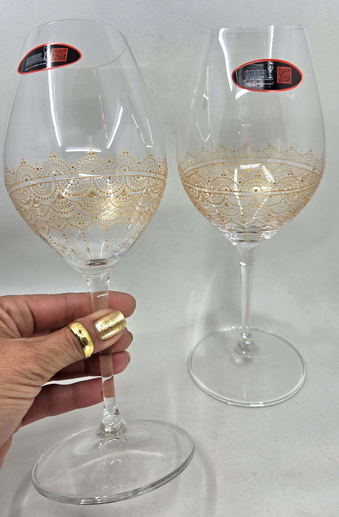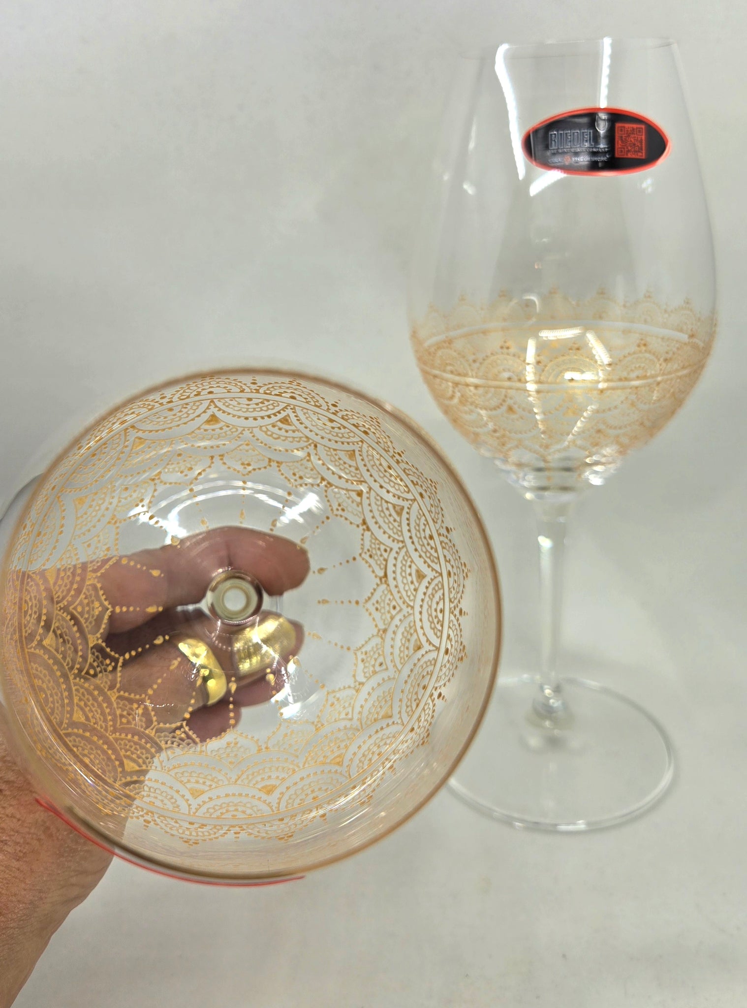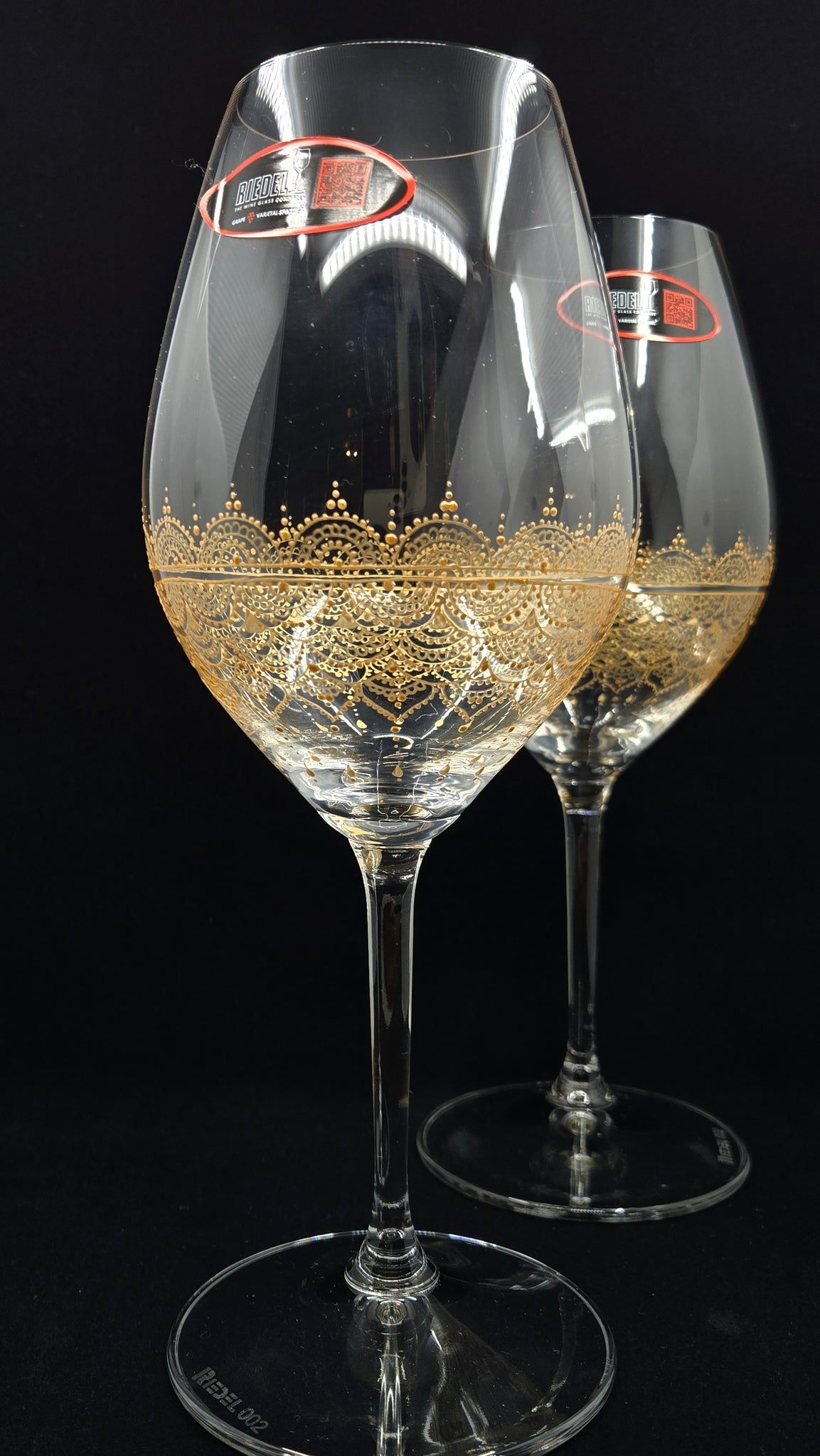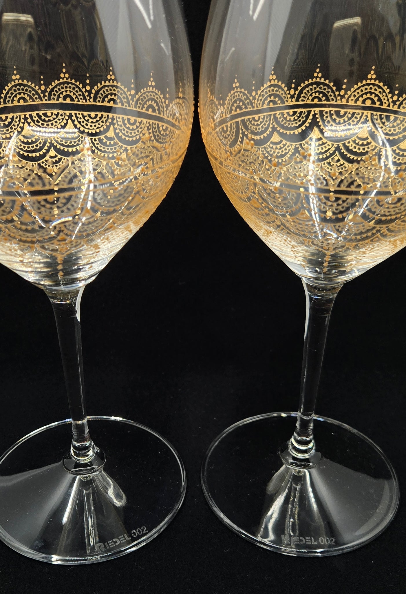 A set of 2 handpainted red wine glasses on Riedel crystal. Riedel glassware is widely considered to be of very good to excellent quality, highly regarded for the clarity and brilliance of the crystal and the ability to enhance the wine-tasting experience through its design. Intricate artwork winds all around the glass. So satisfying to twirl in your hands and marvel at the detail while you are enjoying a glass of wine. When u peer down into this glass as it is getting emptier, u can see a beautiful mandala of sorts on the bottom. These wine glasses are rather unique and definitely conversation pieces. They make excellent gifts! Check out the video to get a full view.