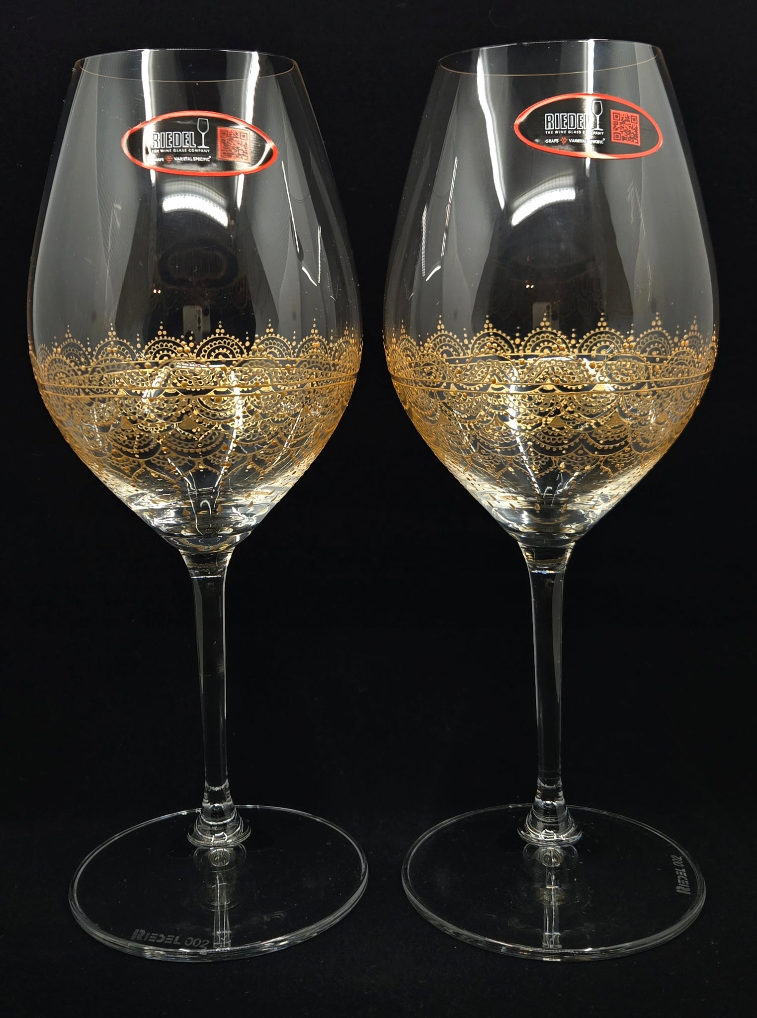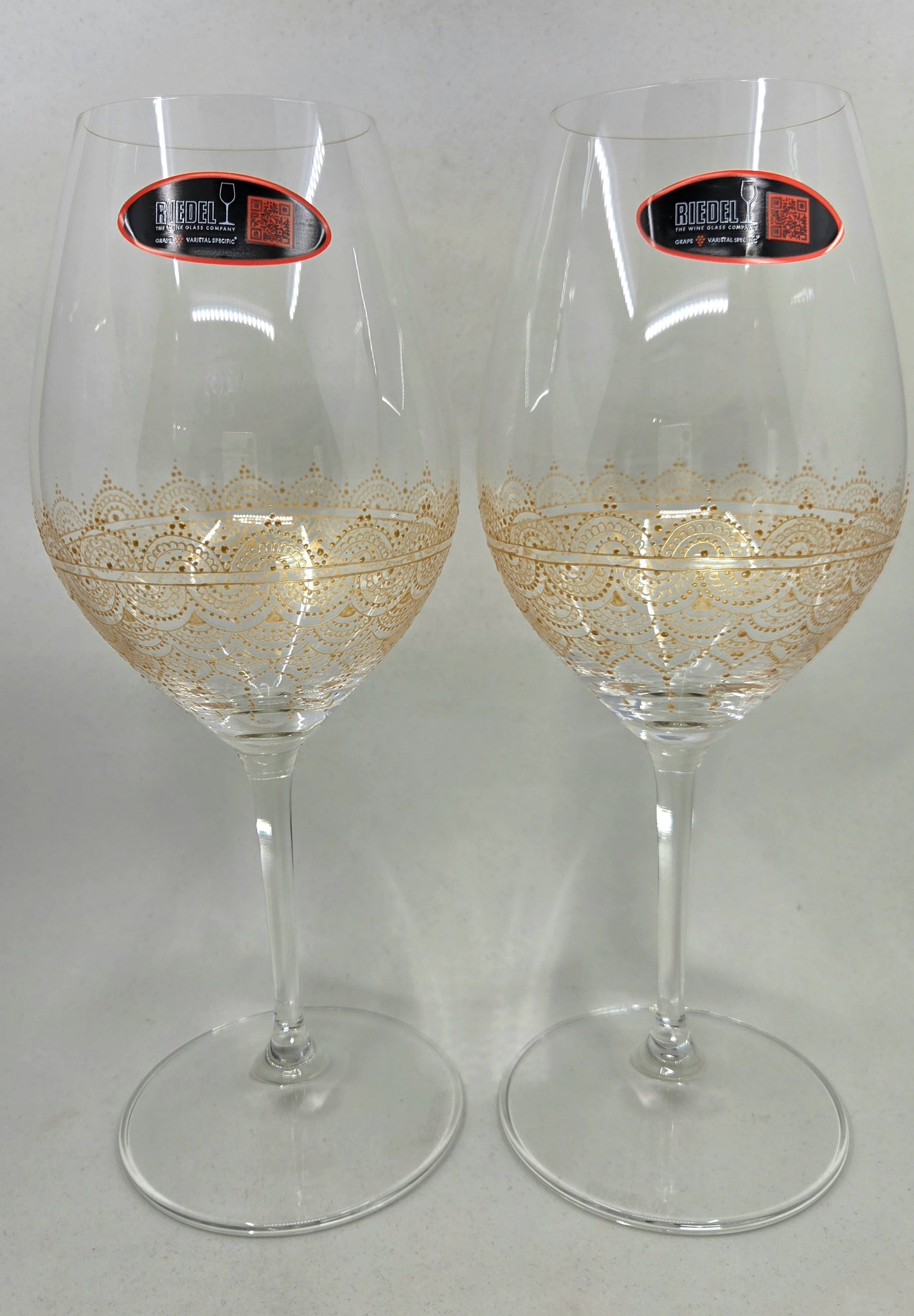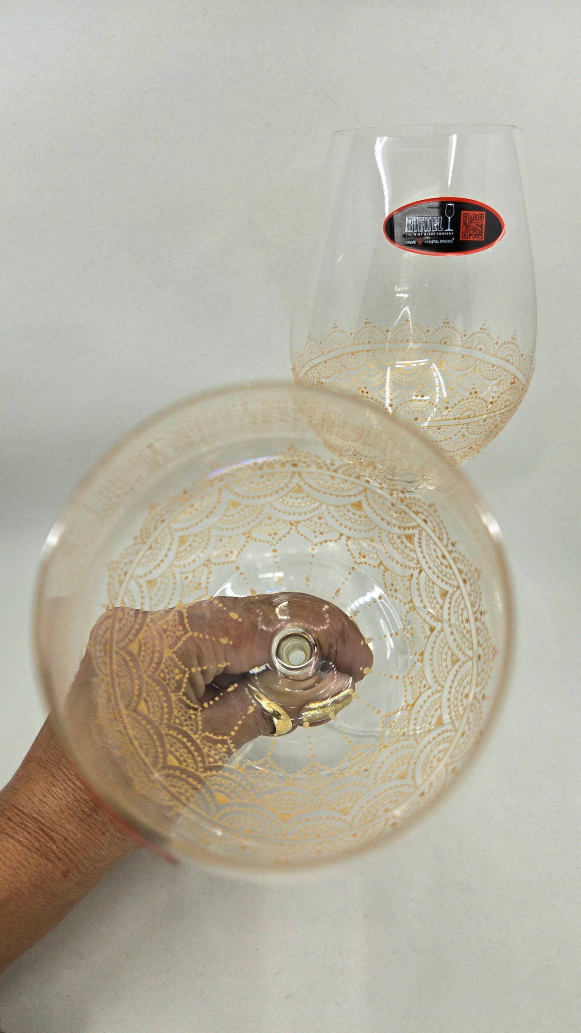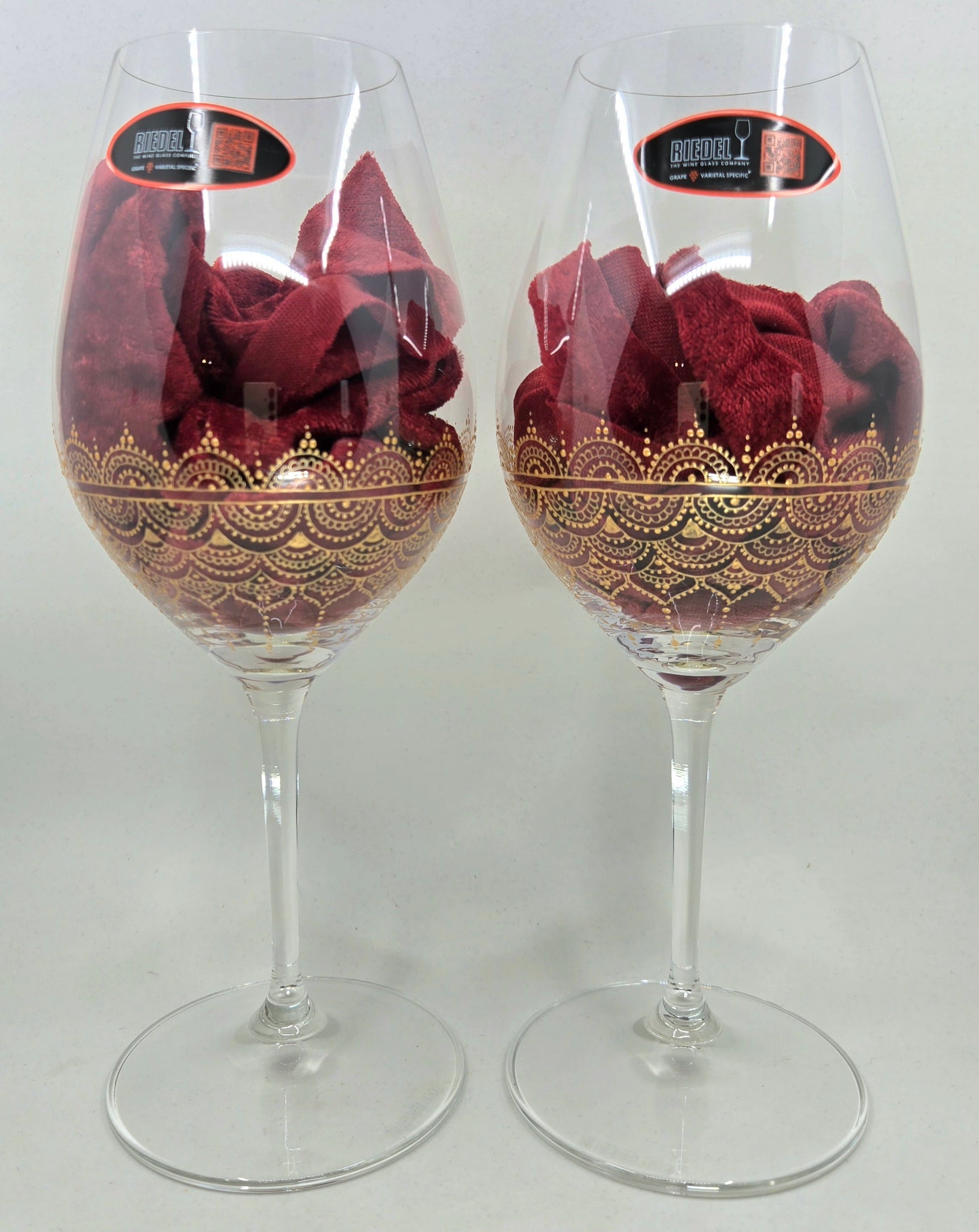 A set of 2 handpainted red wine glasses on Riedel crystal. Riedel glassware is widely considered to be of very good to excellent quality, highly regarded for the clarity and brilliance of the crystal and the ability to enhance the wine-tasting experience through its design. Intricate artwork winds all around the glass. So satisfying to twirl in your hands and marvel at the detail while you are enjoying a glass of wine. When u peer down into this glass as it is getting emptier, u can see a beautiful mandala of sorts on the bottom. These wine glasses are rather unique and definitely conversation pieces. They make excellent gifts! Check out the video to get a full view.