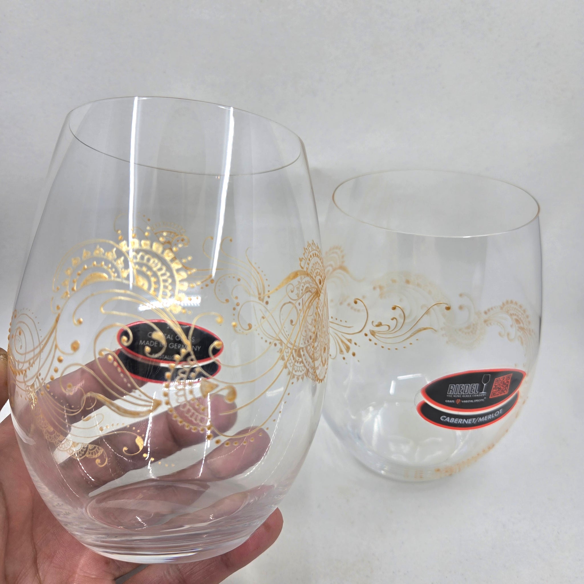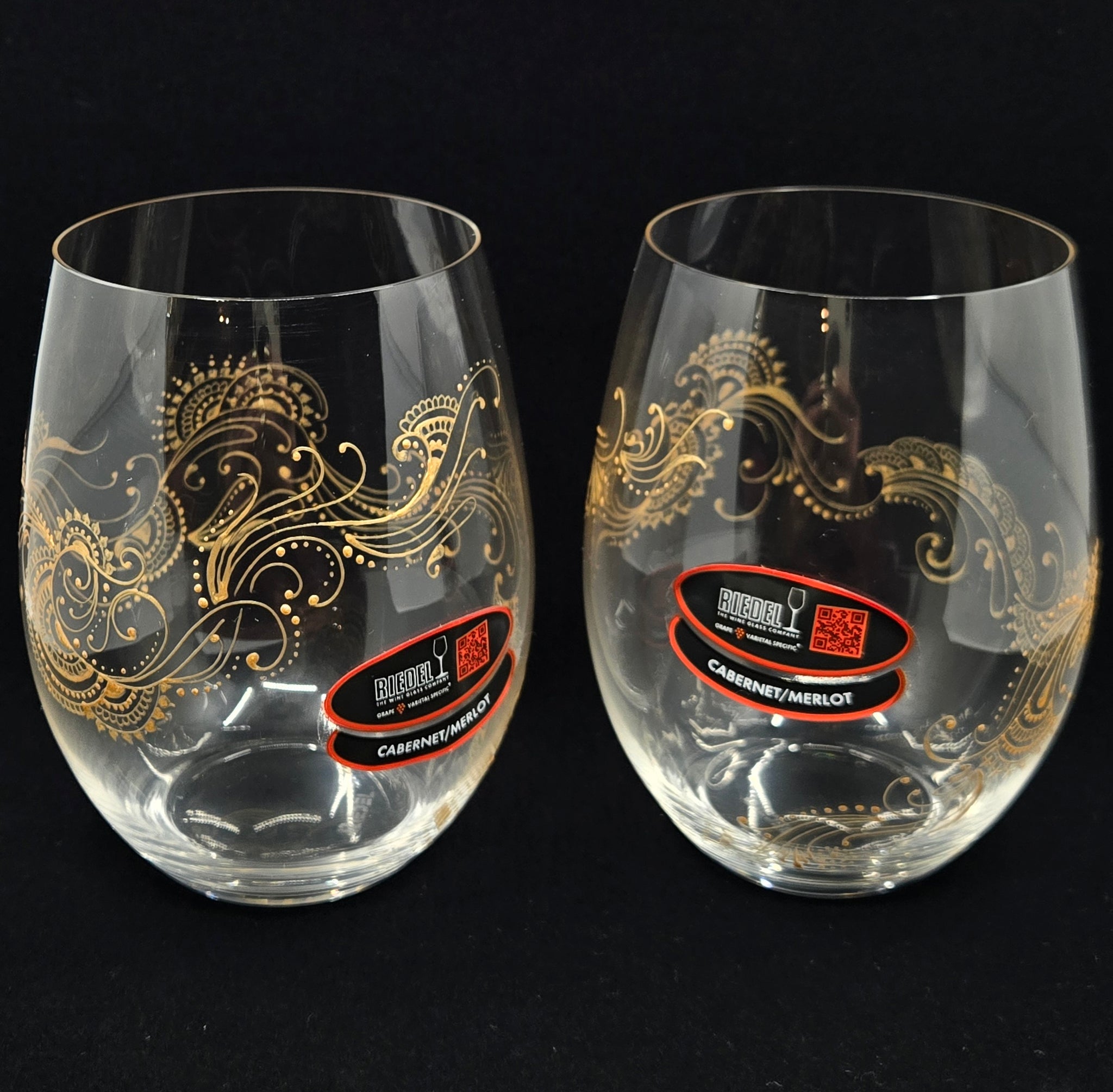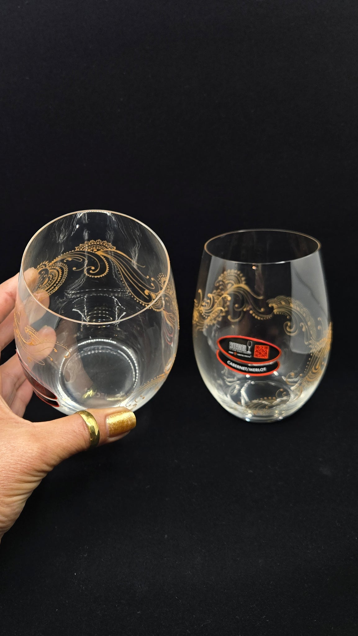 A set of 2 handpainted stemless red wine glasses on Riedel crystal. Riedel glassware is widely considered to be of very good to excellent quality, highly regarded for the clarity and brilliance of the crystal and the ability to enhance the wine-tasting experience through its design. Intricate artwork winds all around the glass. So satisfying to twirl in your hands and marvel at the detail while you are enjoying a glass of wine. These wine glasses are rather unique and definitely conversation pieces. They make excellent gifts! Check out the video to get a full view.