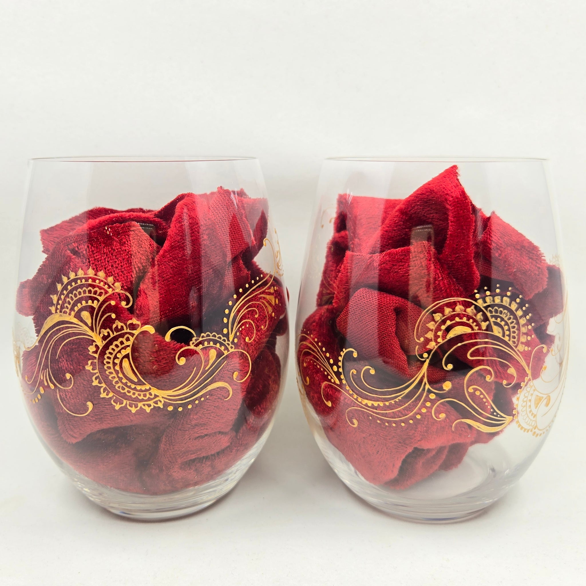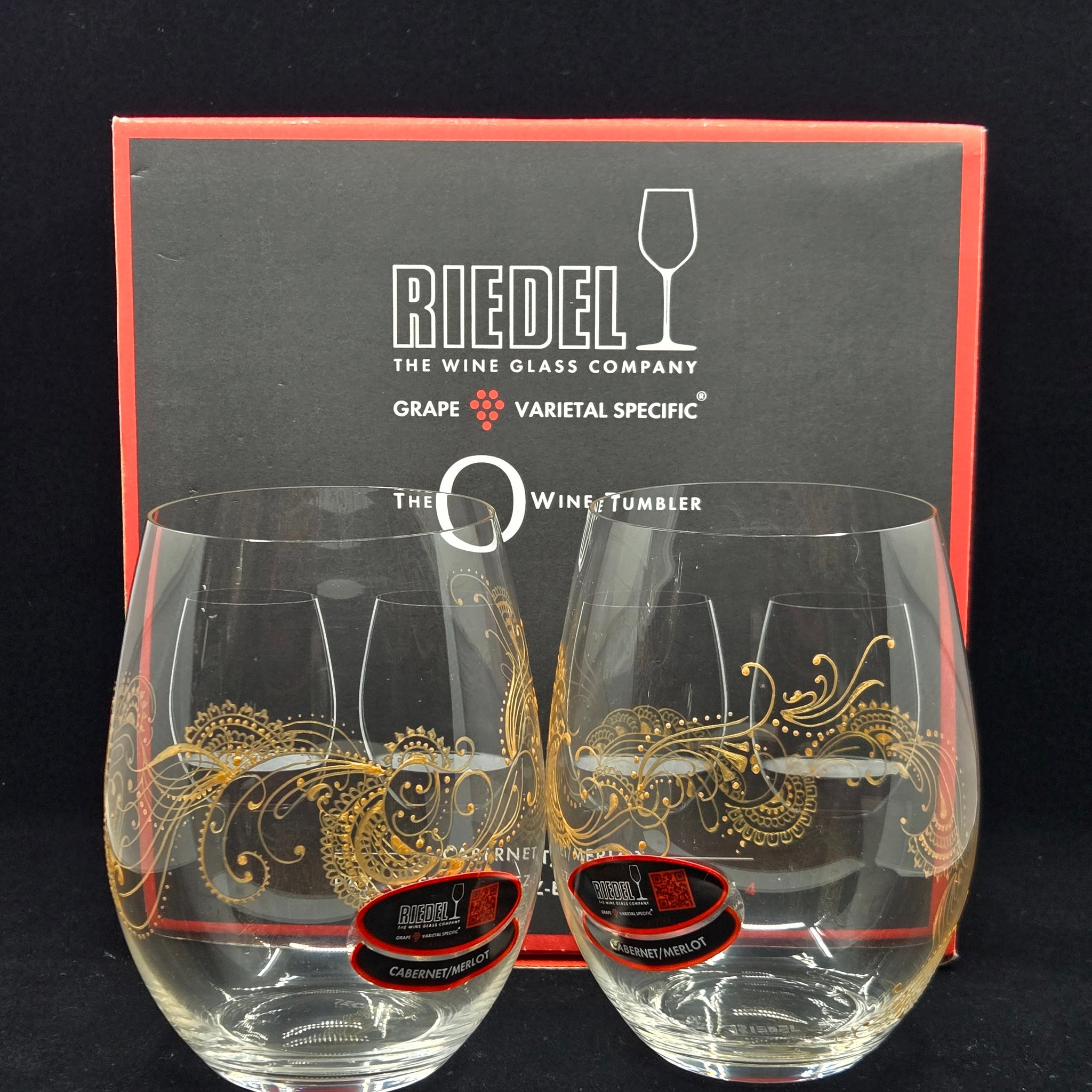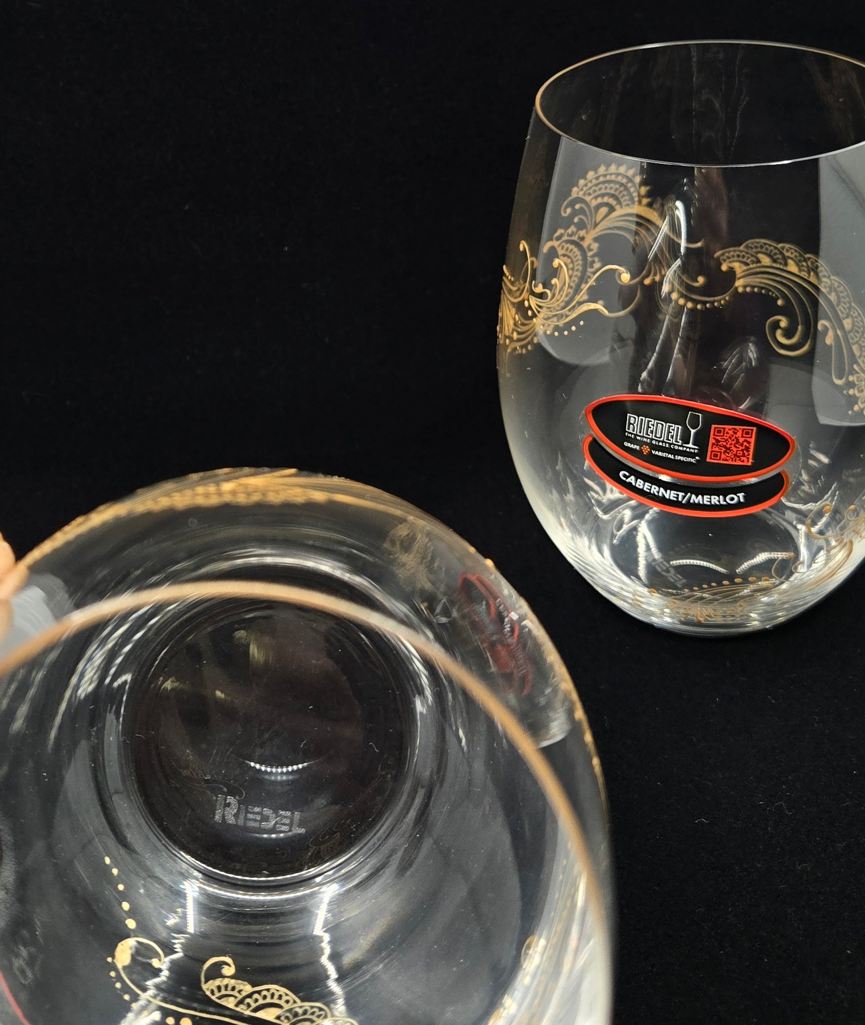 A set of 2 handpainted stemless red wine glasses on Riedel crystal. Riedel glassware is widely considered to be of very good to excellent quality, highly regarded for the clarity and brilliance of the crystal and the ability to enhance the wine-tasting experience through its design. Intricate artwork winds all around the glass. So satisfying to twirl in your hands and marvel at the detail while you are enjoying a glass of wine. These wine glasses are rather unique and definitely conversation pieces. They make excellent gifts! Check out the video to get a full view.