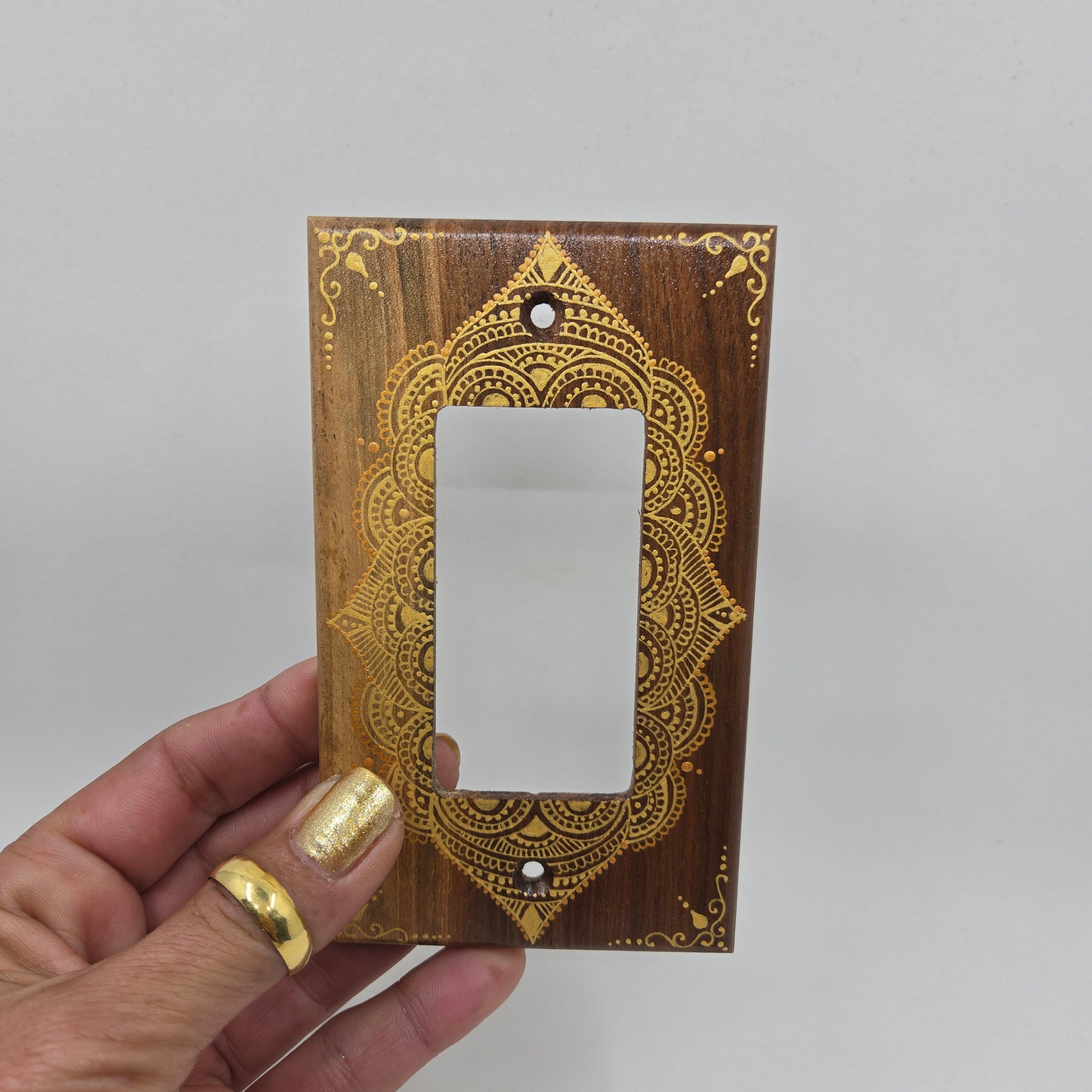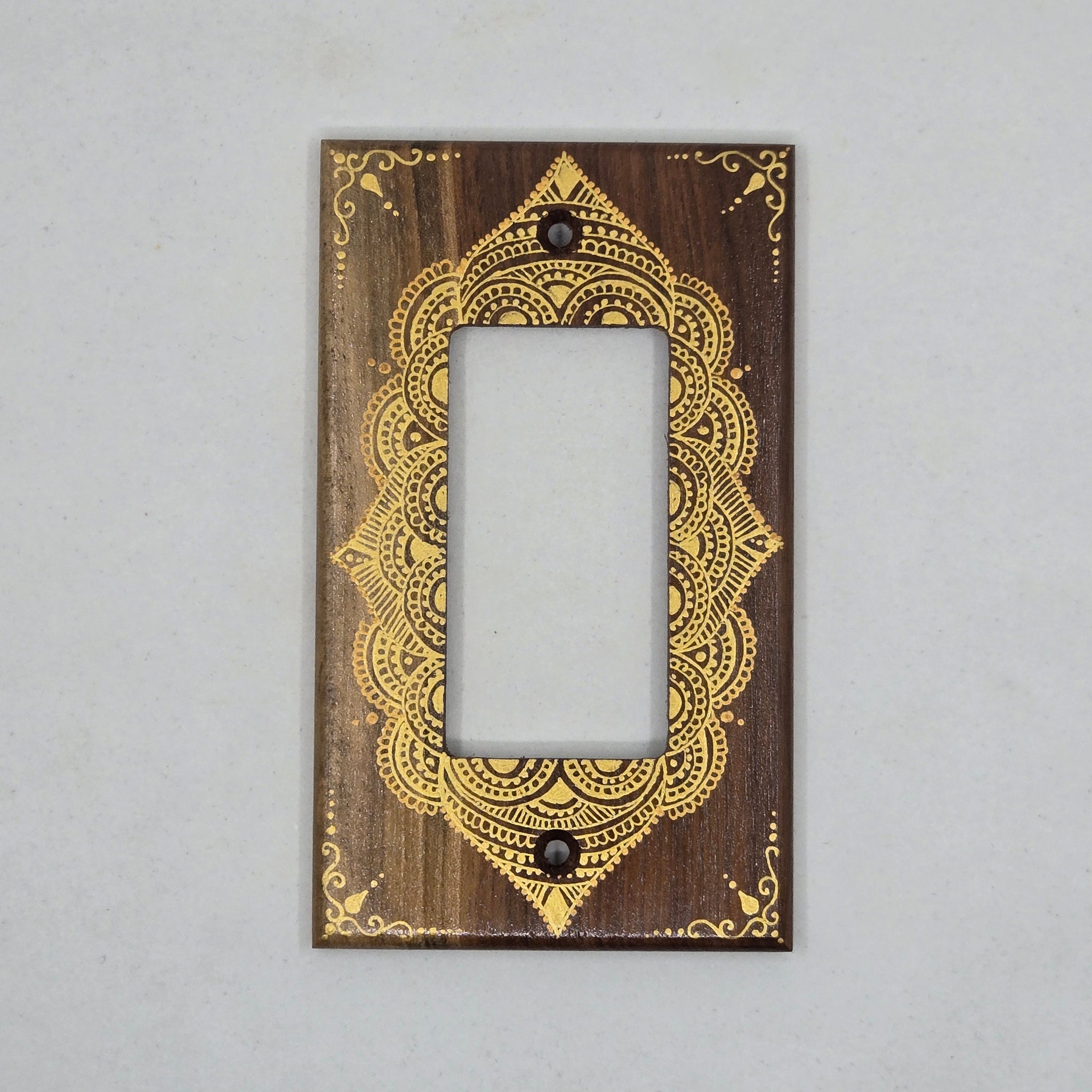 I paint the intricate designs on the beautiful walnut wood and then seal it to protect the artwork. This is a very elegant upgrade to the standard white covers and will stand out as a conversation piece. Why not have some beautiful art to look at as you turn on /off your lights and add a touch of class to your surroundings!